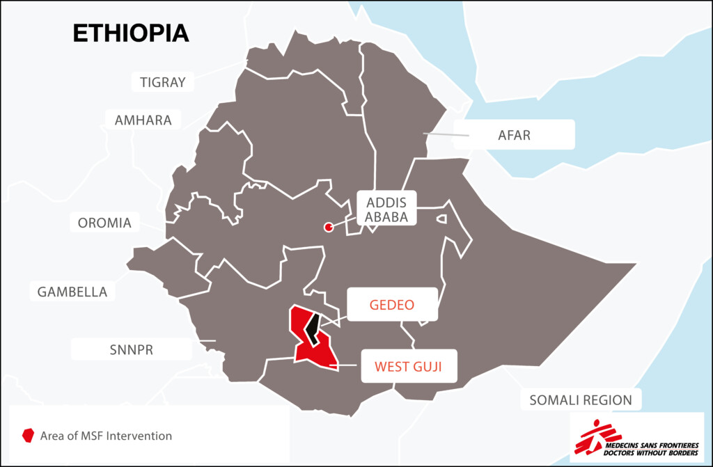 MSF, junto con otros actores humanitarios, está construyendo con urgencia letrinas e instalando infraestructuras de agua y saneamiento en los distritos de Kochere y Gedeb. También está llevando agua limpia en camiones para que la gente pueda beber y mejorando la higiene y el acceso al agua en los centros sanitarios locales.