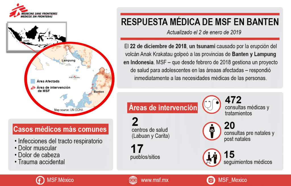 A la fecha, MSF sigue proporcionando apoyo médico a los centros de salud de Lauban y Carita en Pandeglang. Actualmente hay tres clínicas móviles de MSF en operaciones, brindando atención médica a 17 pueblos o centros de salud.