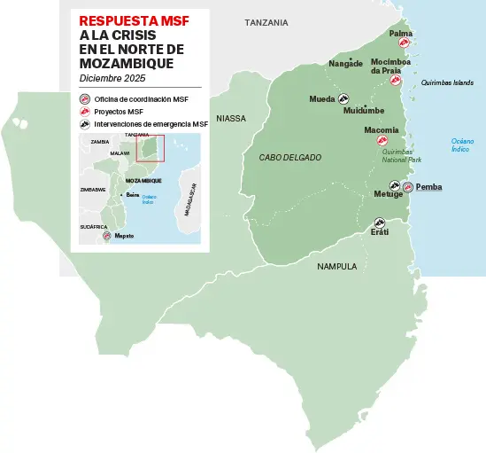 MSF hemos iniciado una intervención de emergencia de tres meses en el distrito de Eráti, provincia de Nampula, para atender las crecientes necesidades humanitarias y médicas de la población. Seguimos brindando servicios de salud vitales a las comunidades de acogida y a las personas que se enfrentan a la violencia y el desplazamiento en el norte de Mozambique. En Cabo Delgado, MSF gestionamos proyectos en Mocímboa da Praia, Macomia y Palma, y apoyamos la respuesta a un brote de cólera en Nanlia. Proporcionamos consultas externas generales, atención de urgencias, servicios de maternidad y pediatría, tratamiento para el VIH y la tuberculosis, y apoyo psicosocial y de salud mental.