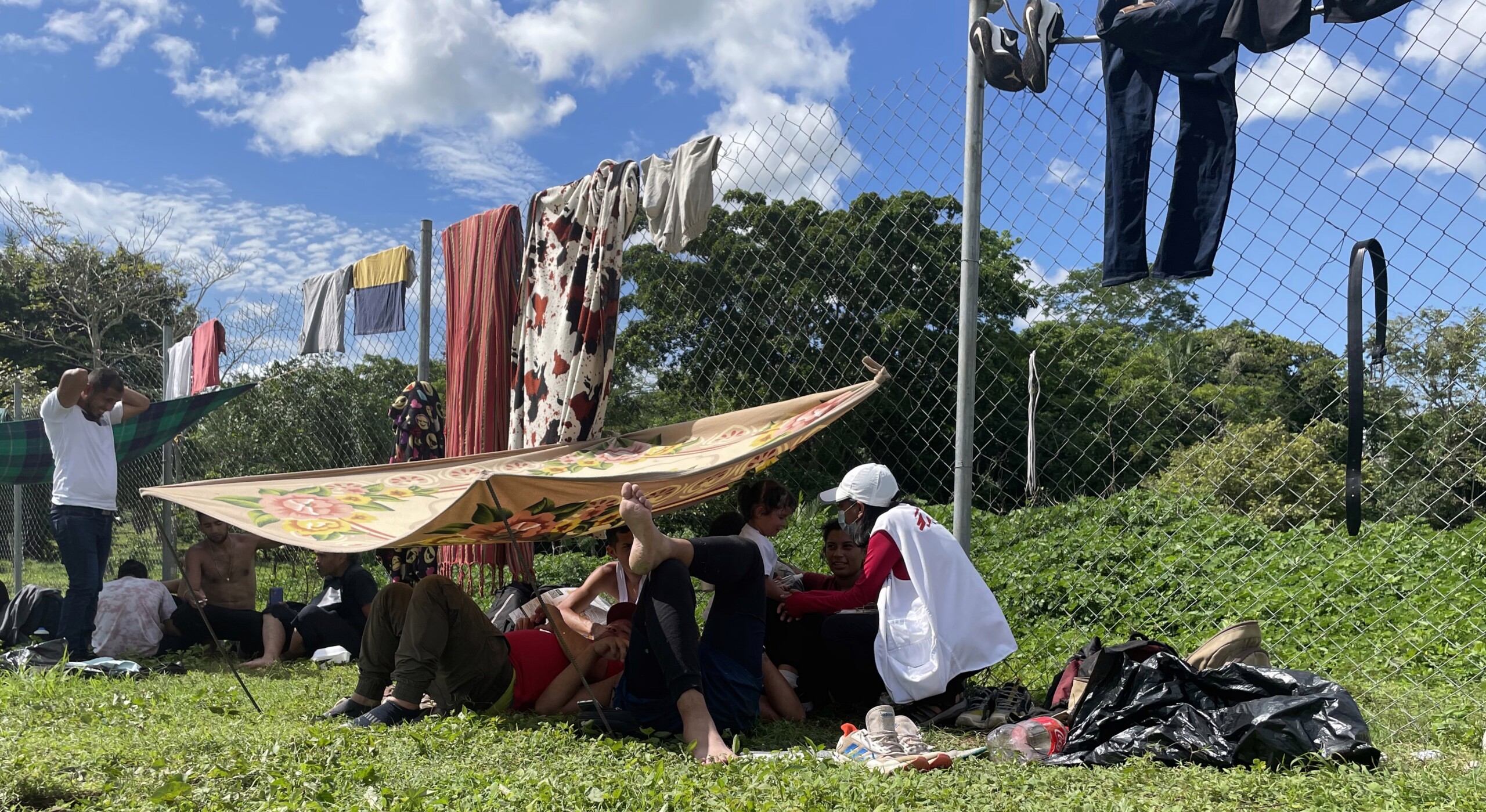 Estación Migratoria de San Vicente, Panamá, 16 de mayo de 2022. Más de mil kilómetros recorridos en bus o caminando separan a tres familias venezolanas de sus casas. Migraron de su país para sobrevivir, como señalan. Están sentadas en el césped, esperando a que se desocupe una carpa para pasar la noche. En esta estación, en un solo día, están llegando diariamente entre 300 y 900 personas que quieren avanzar cuanto antes a Costa Rica y seguir hacia Estados Unidos.