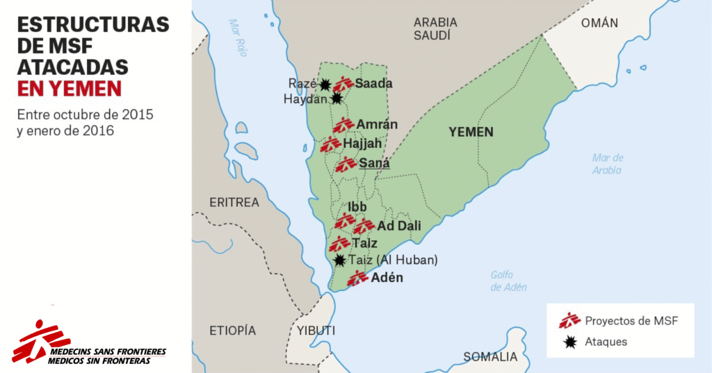 Ya en 2016, el 10 de enero, fue atacado el hospital Shiara, al que MSF apoya en el distrito de Razé (también en Saada); seis personas murieron y otras siete resultaron heridas, en su mayoría personal médico y pacientes.