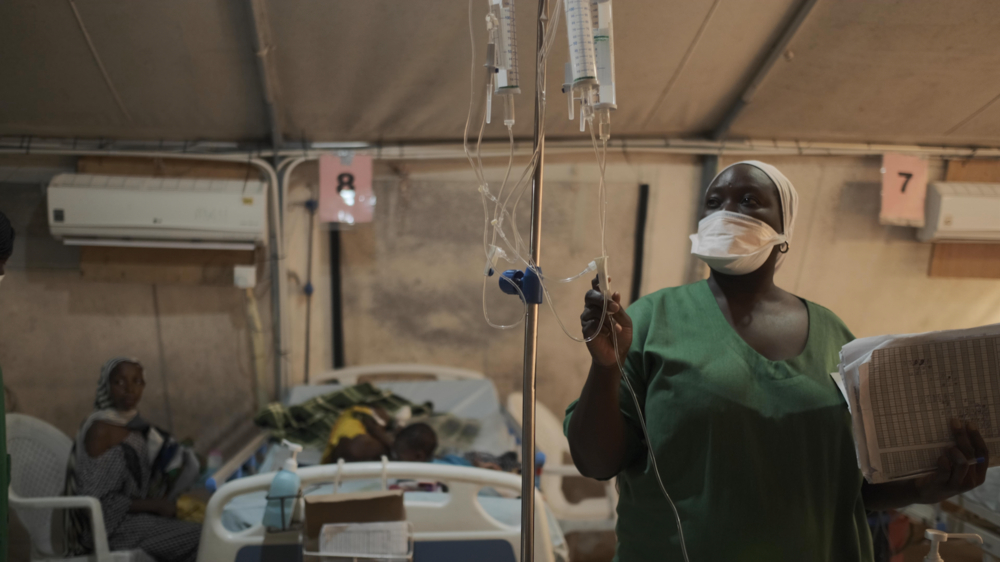 An MSF nurse monitors the IV fluid admitted to a malnourished child in MSF in-patient therapeutic feeding centre in Maiduguri, Borno State.