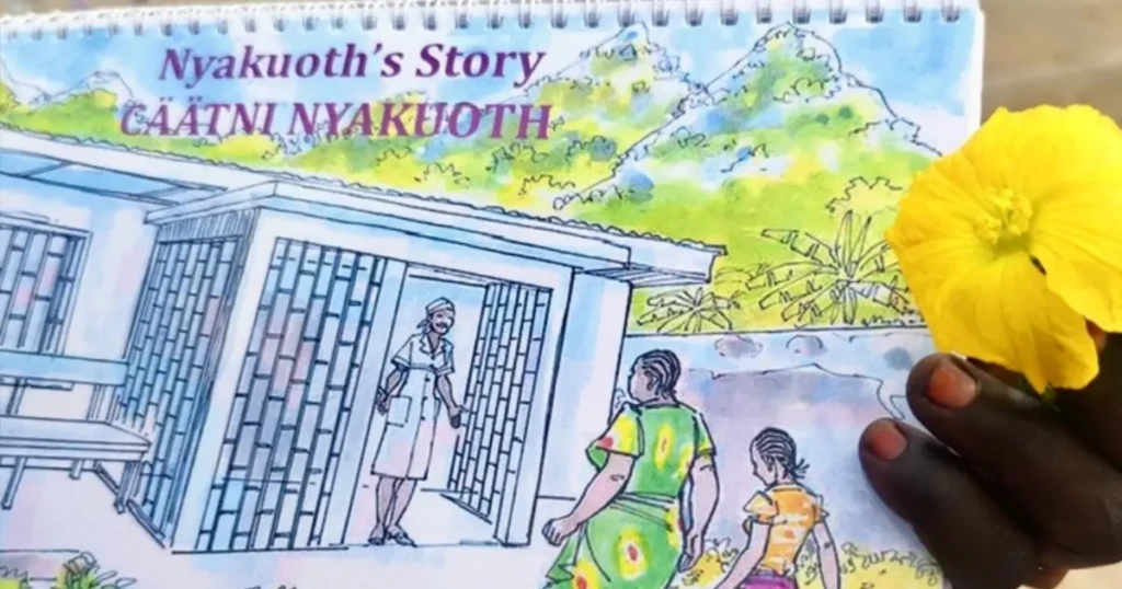 Nuestra compañera Nyemal trabaja para Médicos Sin Fronteras (MSF) en el campo para personas internamente desplazadas de Bentiu, en el norte de Sudán del Sur. El campo es grande, alrededor de 105,000 personas viven en él, incluida la propia Nyemal, que llegó con su familia hace unos siete años para escapar del conflicto armado.