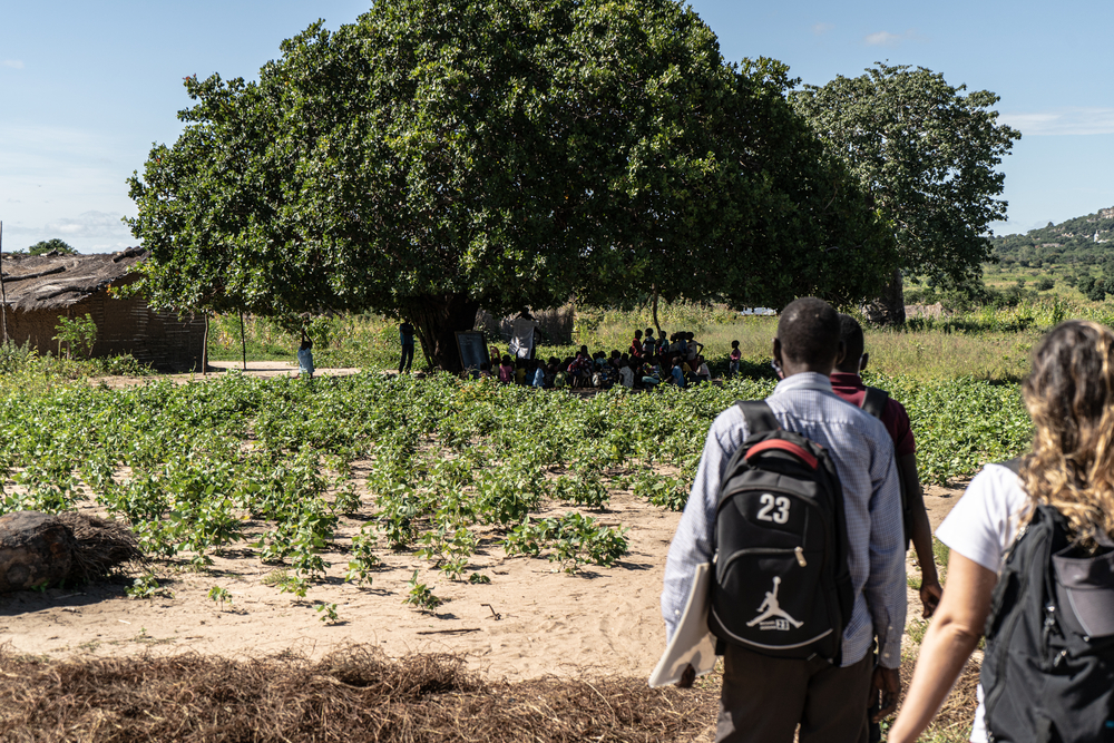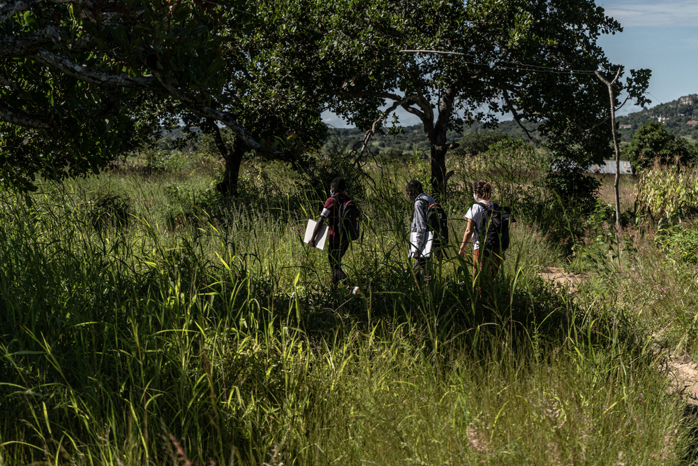 Mientras avanzábamos por los pastos verdes de las afueras de Montepuez, nos topamos con dos grupos de niñas y niños que asistían a una clase escolar bajo la sombra de árboles con forma de seta que les protegían de un sol inclemente. Al vernos, los niños del primer grupo nos saludaron y comenzaron a reír, probablemente extrañados de ver a extranjeros caminando por allí. Por el contrario, el segundo grupo reaccionó de manera completamente distinta. Los menores salieron corriendo y desaparecieron entre los arbustos o se escondieron detrás de los árboles.