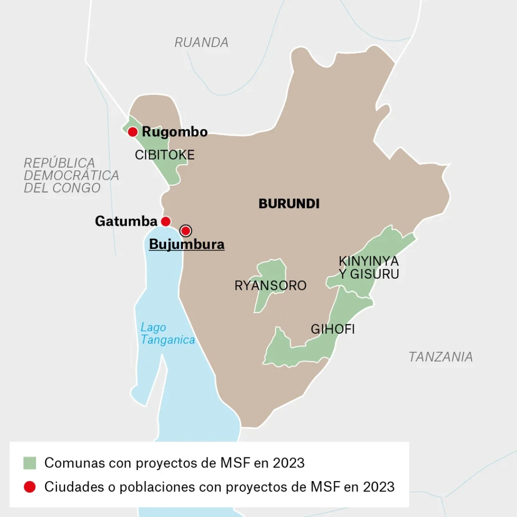 Nº de profesionales * de MSF en 2023: 95 | Gastamos 3,7 millones de € | MSF trabajamos por primera vez en Burundi en 1992