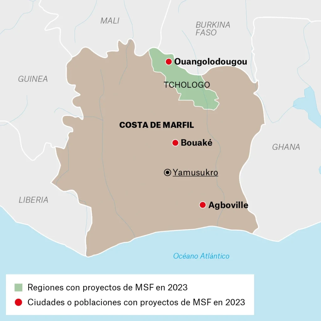 En 2024, Médicos Sin Fronteras dirigimos proyectos en Costa de Marfil para asistir a personas refugiadas de Burkina Faso y mejorar la atención a personas con epilepsia y enfermedades mentales.
