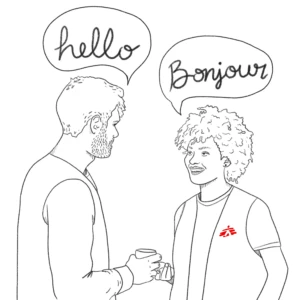 Las operaciones de MSF se encuentran en distintos países la mayoría de ellos tienen como idioma oficial el Frances, además al ser una organización internacional, nuestros equipos están integrados por personas de diversos orígenes que adoptan como idioma común de trabajo el más hablado en el país en el que desarrollan su labor. Por ejemplo, el inglés en India o el francés en Níger. Un trabajador internacional desarrolla sus actividades en estrecha colaboración con el personal local y con funcionarios gubernamentales locales. Además, la elaboración de informes se realiza en el idioma internacional del país.