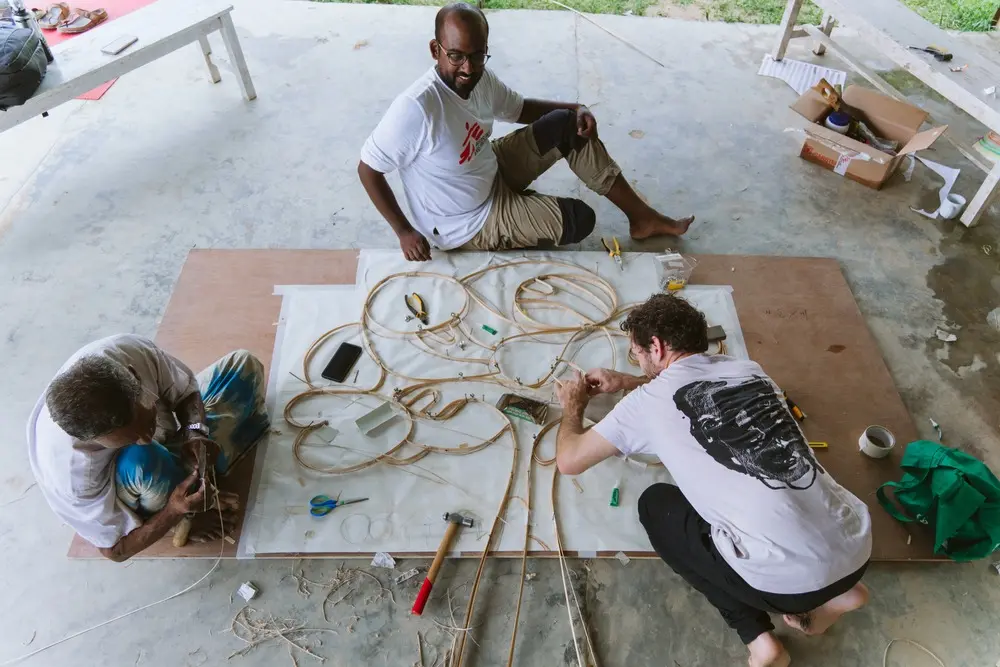 Durante un breve paréntesis para reponerse del calor, Nurus Safar y Nuru Salam se sientan a charlar con Tasman Munro, diseñador social y creador junto a ellos de esta obra.
