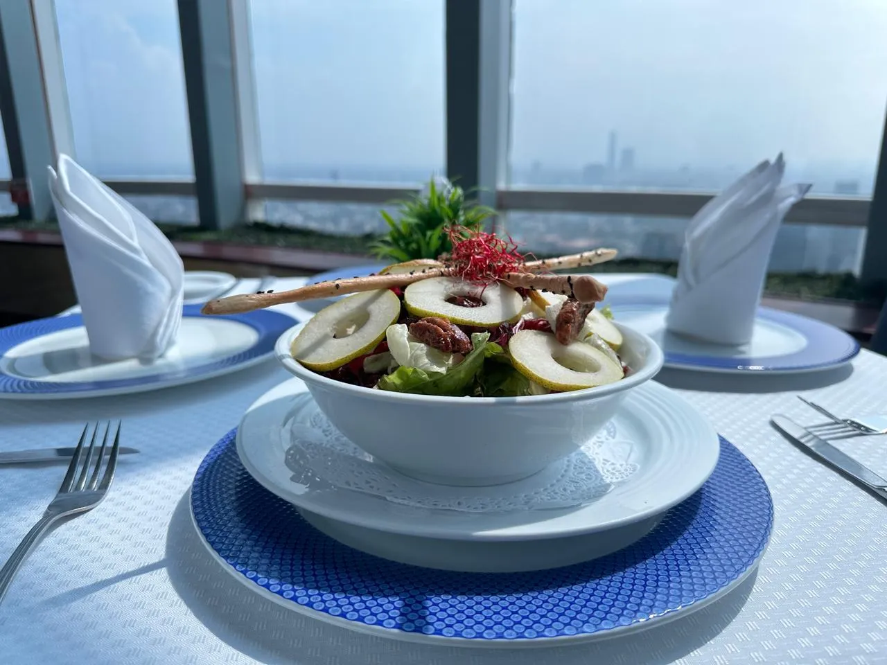 Platillo: Ensalada de Pera, nuez caramelizada, queso de cabra y vinagreta de naranja