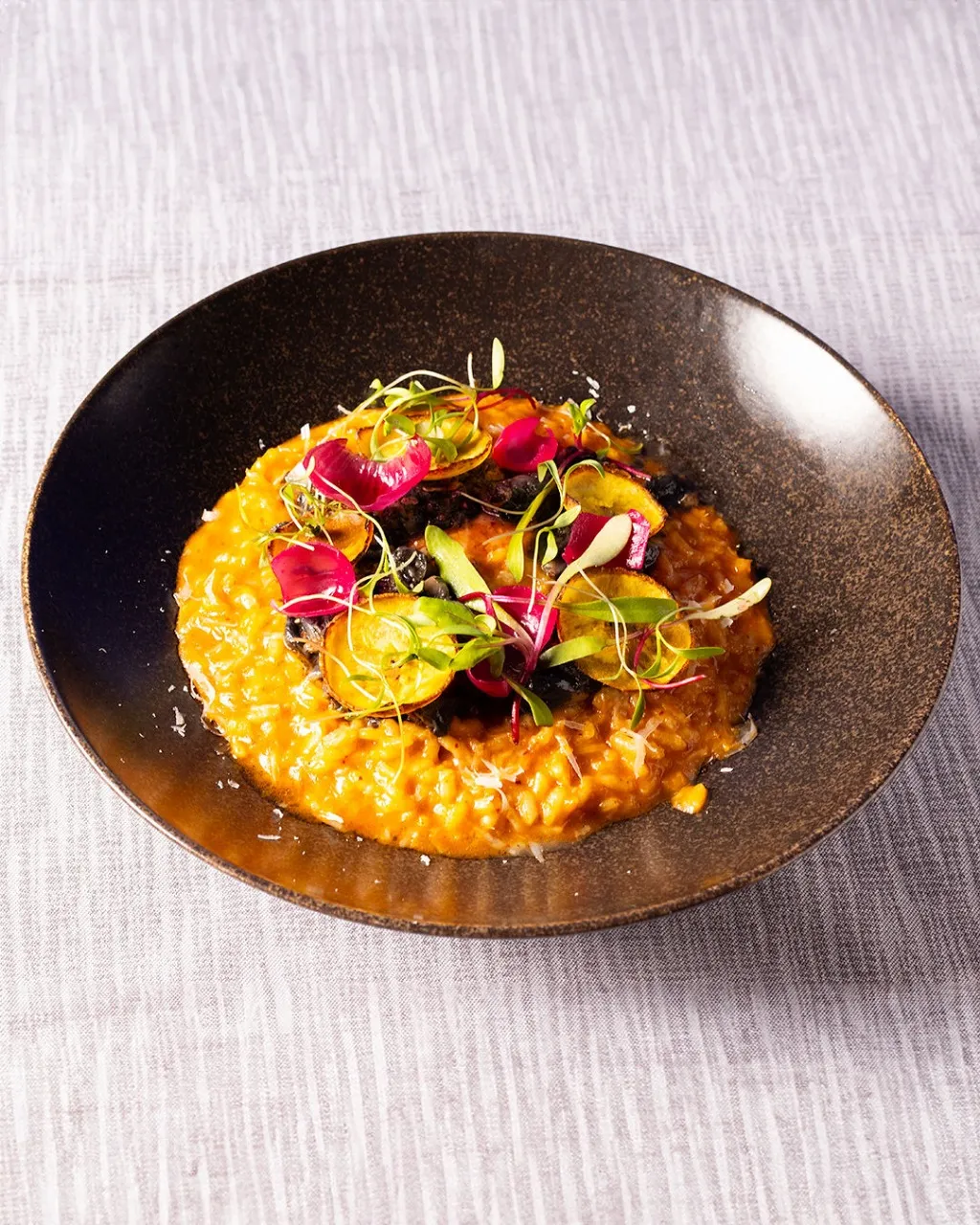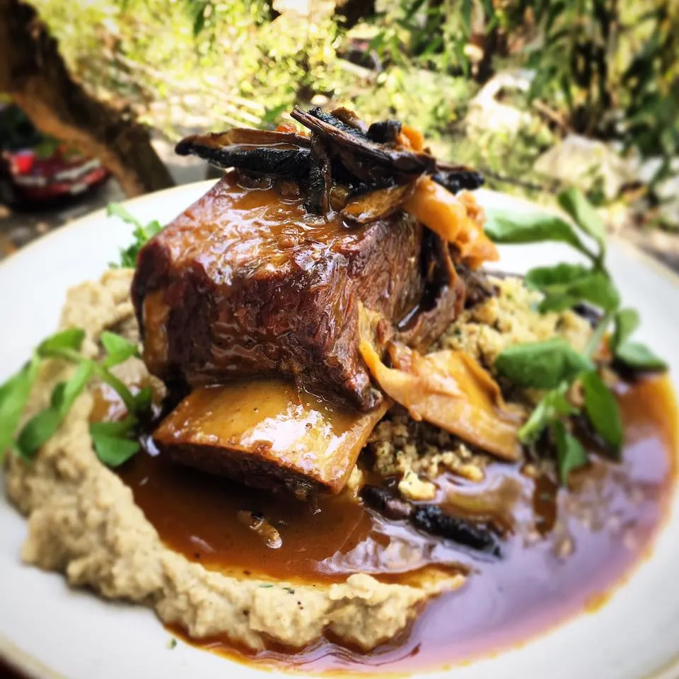 Platillo: Costilla de res estofada en cerveza y chiles secos, con puré de berenjena ahumada y rábanos rostizados
