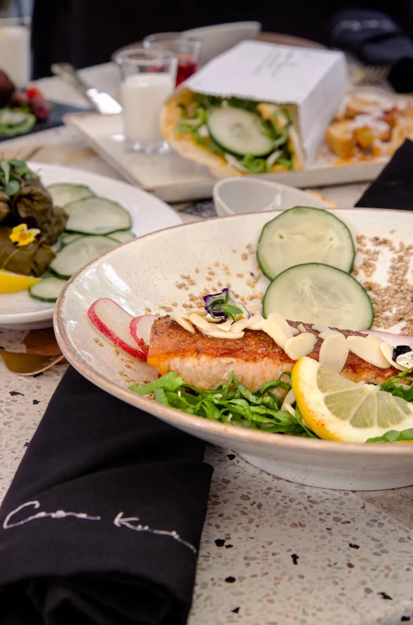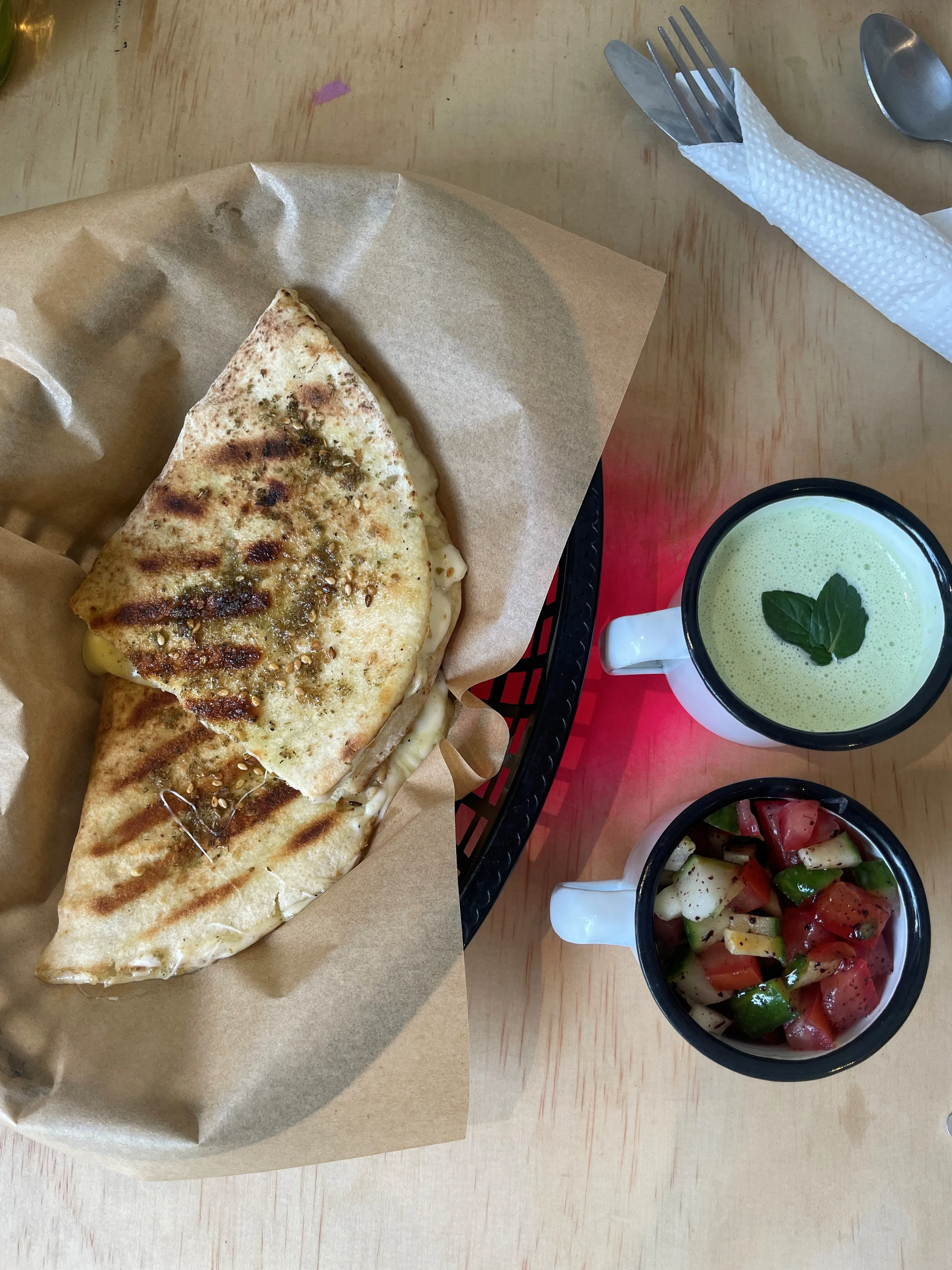 Platillo: Quesadilla árabe de quesos y zaatar con aderezo picante de menta y pico de gallo con pepino