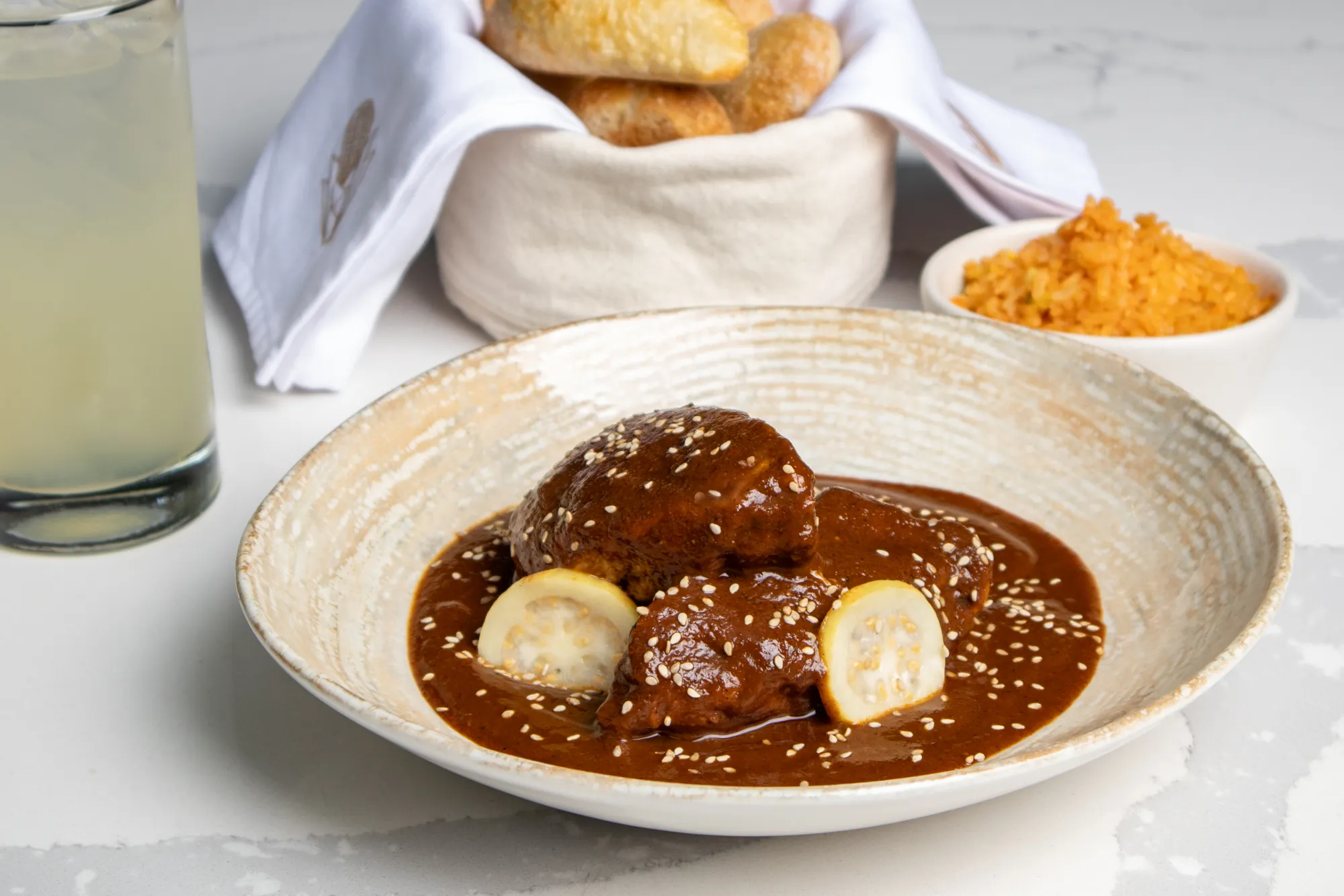 Platillo: Chile relleno de tamal de berenjena con requesón y mole negro